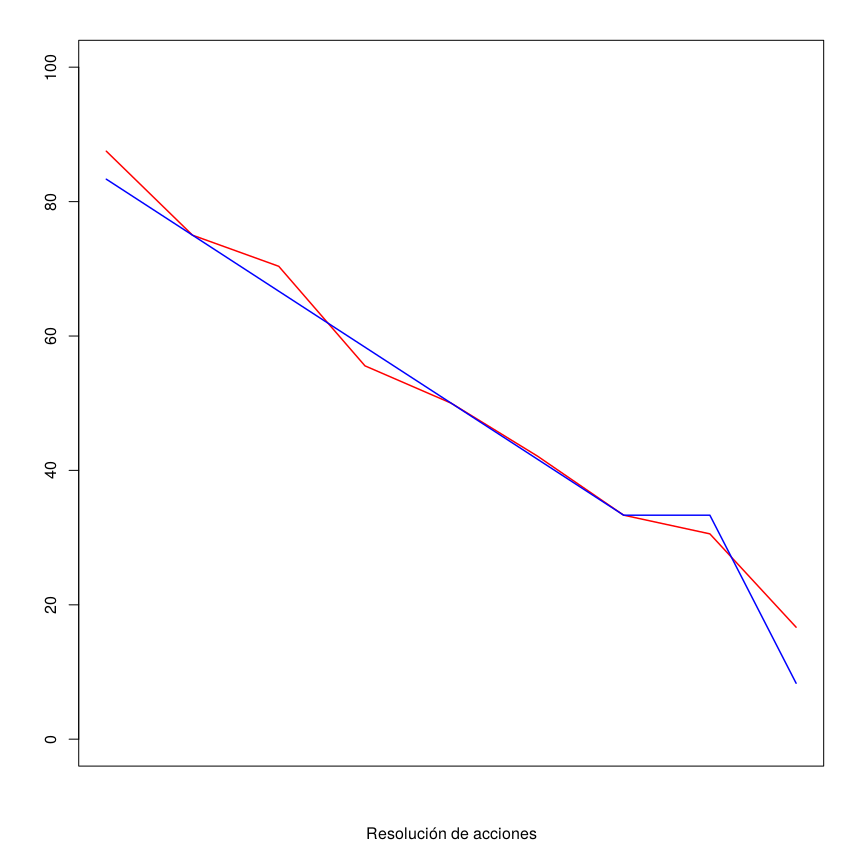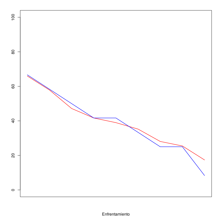 Por último, a modo de demostración de la bondad del ajuste del sistema d12 (azul) con el antiguo (rojo), he elaborado dos gráficas en las que aparecen todas las tiradas de resolución de acciones y enfrentamientos para que se aprecie que las probabilidades de éxito/fracaso son tan similares que en mesa difícilmente llegarían a apreciarse.