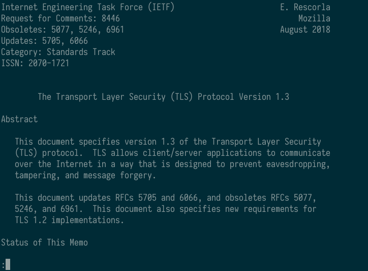 Seré breve. Últimamente estoy leyendo bastantes RFCs y siempre acudo a la web de la ietf porque tiene un formato sobresaliente y sin frivolidades, aunque me gustaría una alternativa de emergencia para estudiar offline. El paquete doc-rfc-std de Ubuntu nos trae todo el catálogo al directorio /usr/share/doc/RFC/ para poder consultar desde nuestro emulador de terminal favorito estos documentos, con herramientas UNIX como less.