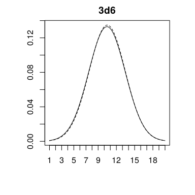 | 3d6 | N(10.5, 2.958) | N(10.4525, 3.0009) |